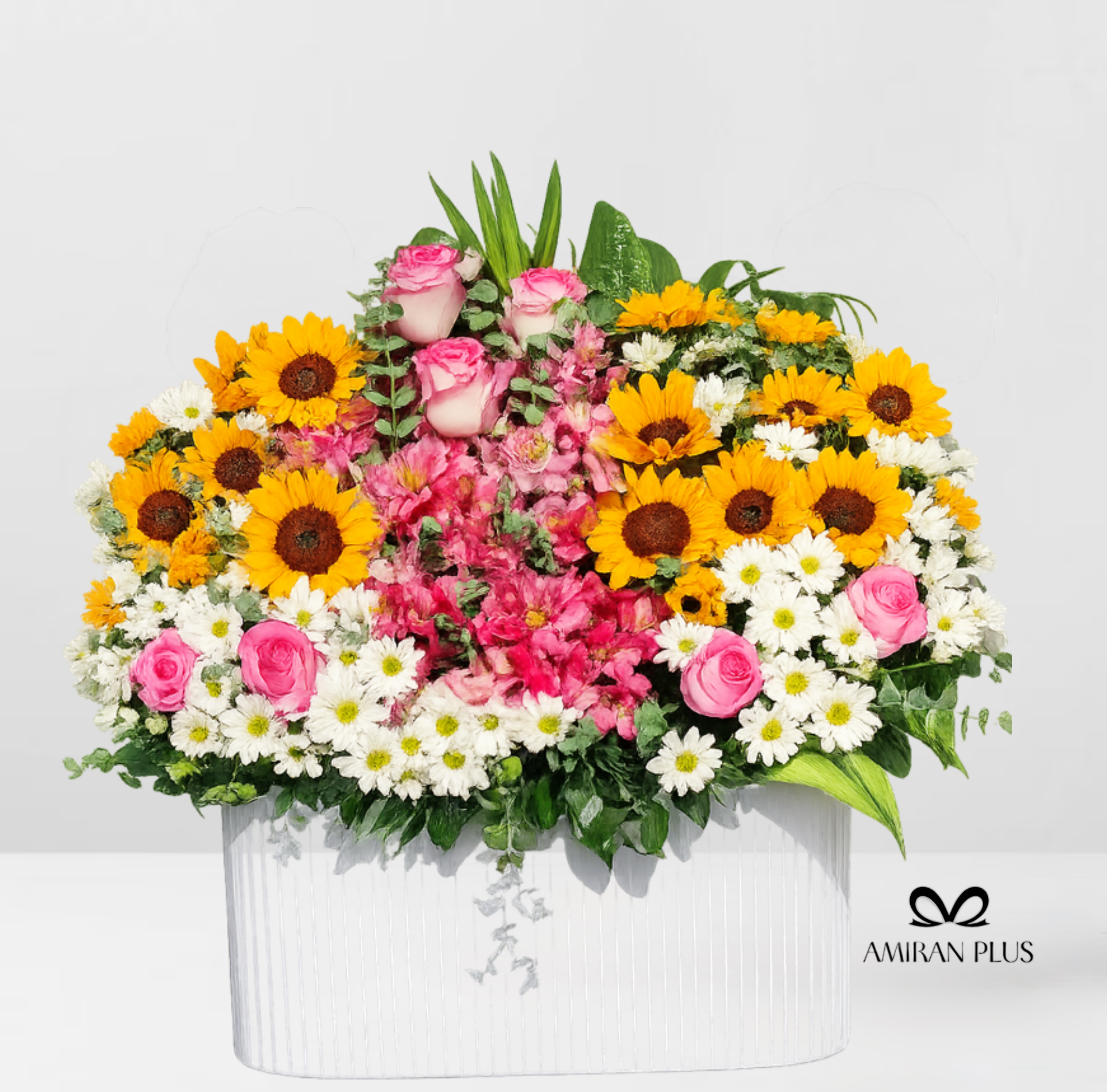 باکس گل ترکیبی آفتابگردان و رز صورتی با طراحی خاص و ابعاد بزرگ ۷۰ در ۶۰ سانتیمتر، انتخابی فوقالعاده برای افرادی است که به دنبال یک باکس گل شاد، خاص و متفاوت هستند.